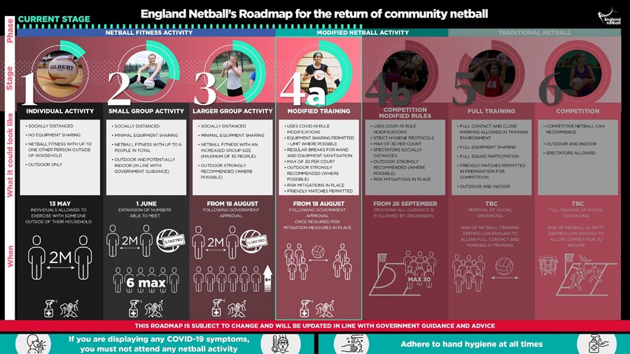 Following the Government’s announcement on 23 June we have reviewed the Roadmap and we are in Stage 2 for now. Once the Government gives us the green light, we hope to see an enhanced form of netball activity taking place (in line with stage 3 or 4) in September with a competitive element returning slightly later.